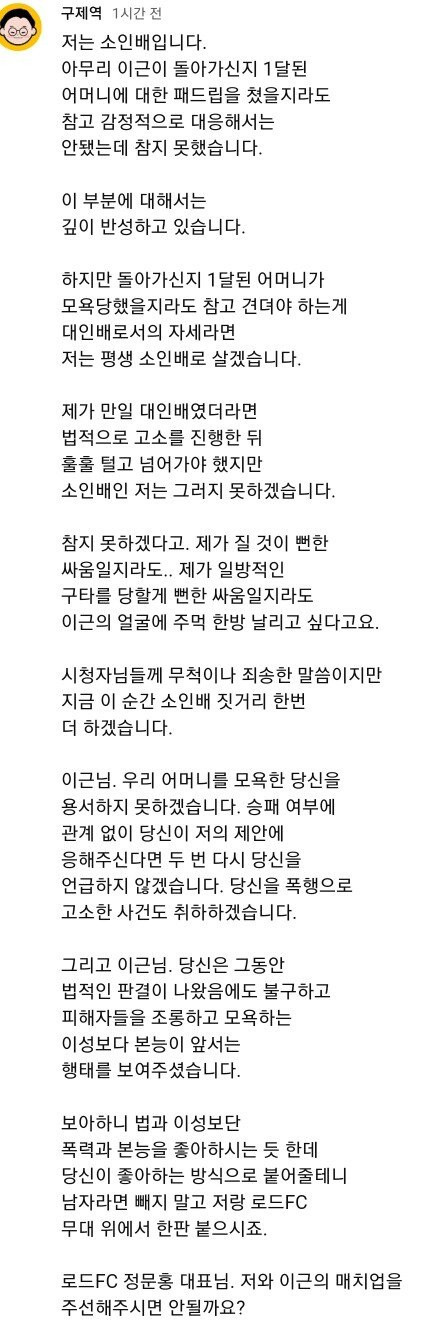 [속보] 구제역, 로드FC 정문홍 대표한테 이근과의 매치 제안