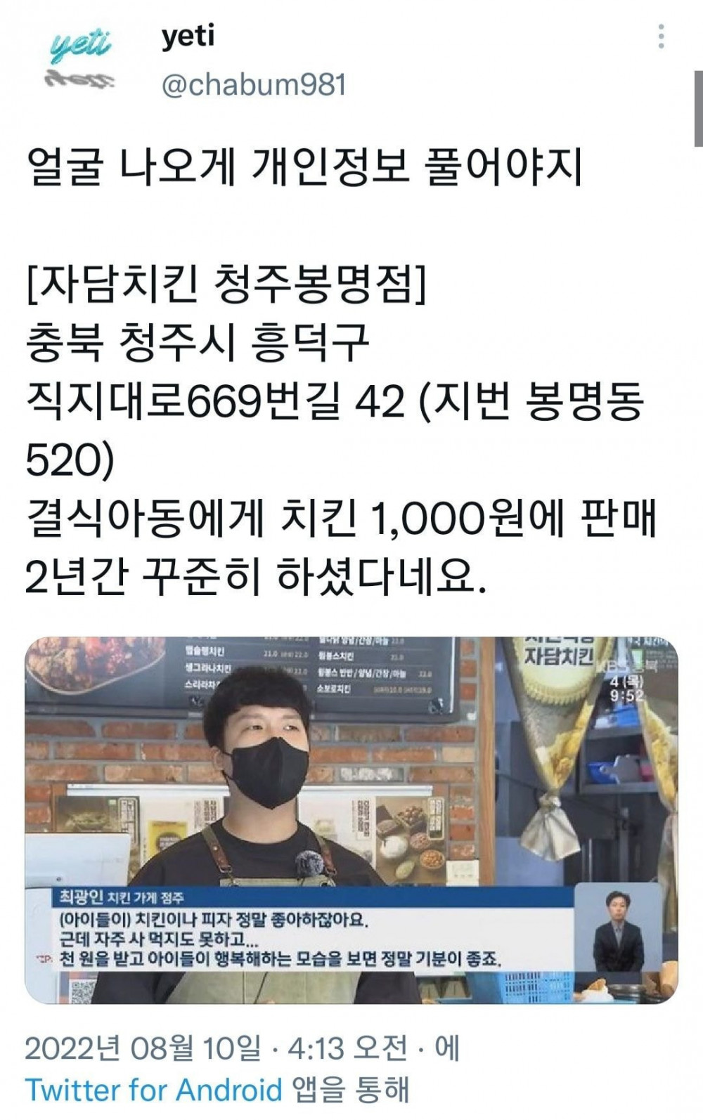 결식아동에게 치킨 천원에 판매한 치킨집 다른 미담