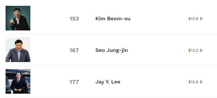1위 카카오 김범수 138억불 2위 셀트리온 서정진 132억불 3위 삼성전자 이재용 126억불