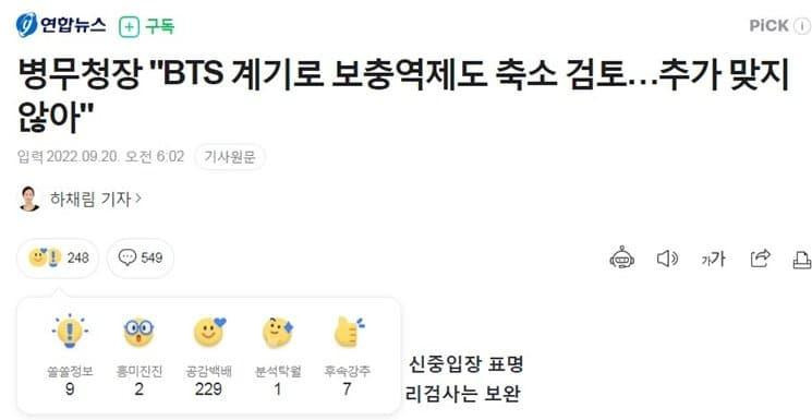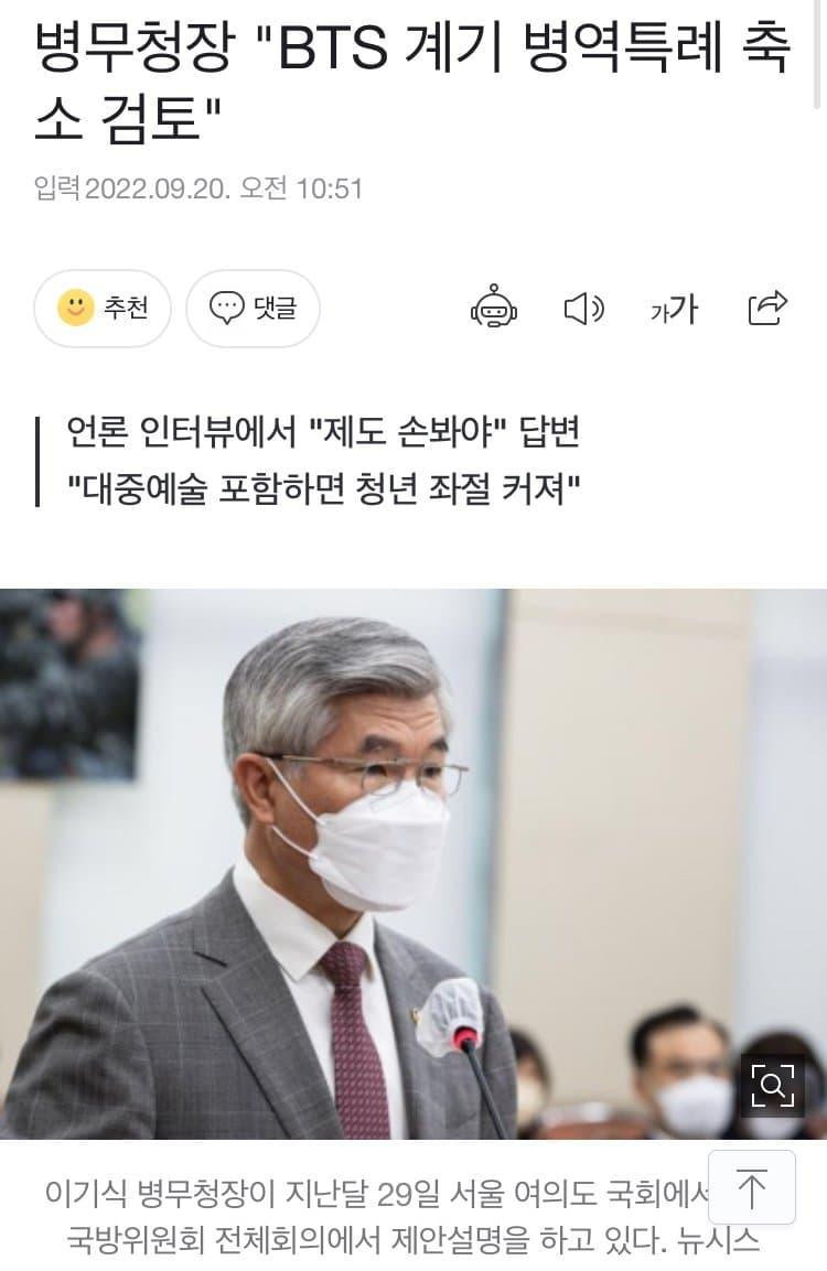병무청장 "BTS 계기 병역특례 축소 검토"