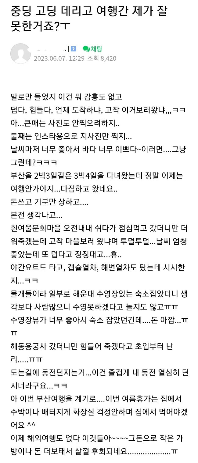 중딩 고딩 데리고 여행 간 제 잘못인가요?