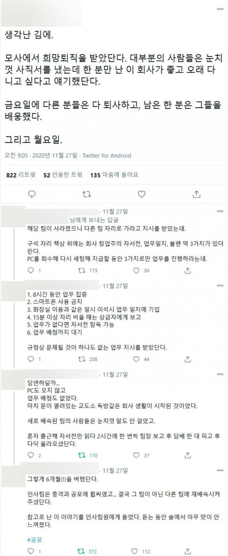 모 대기업 희망퇴직 거부자의 하루 일과