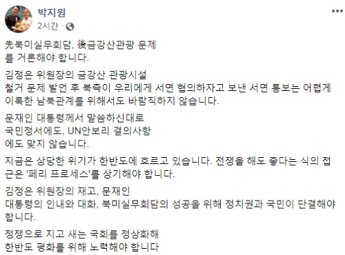 박 의원은 26일 자신의 페이스북에 올린 글에서 “김정은 위원장의 금강산 관광시설 철거 문제 발언 후 북측이 우리에게 서면 협의하자고 보낸 서면 통보는 어렵게 이룩한 남북관계를 위해서도 바람직하지 않다”라며 이같이 밝혔다.