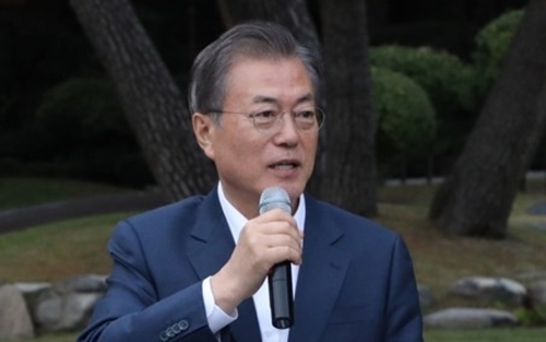 | 문재인 대통령이 지난 25일 오후 청와대 녹지원에서 열린 출입기자단 초청 간담회에서 인사말을 하고 있다. 연합뉴스 |
