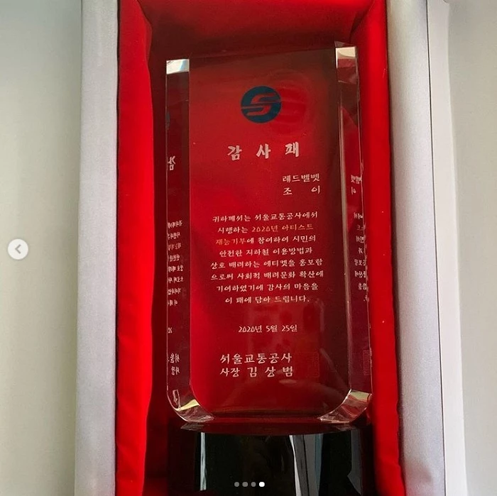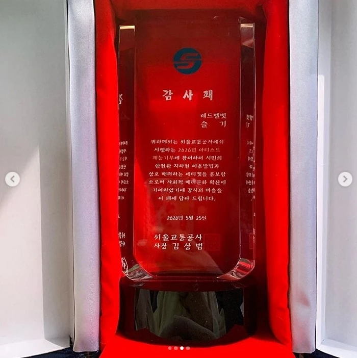 25일 SM엔터테인먼트는 레드벨벳 공식 인스타그램에 여러 장의 사진을 공개했다. 재능기부로 지하철 안내방송을 녹음한 슬기·조이가 서울교통공사로부터 감사패와 꽃다발을 받는 사진이었다.