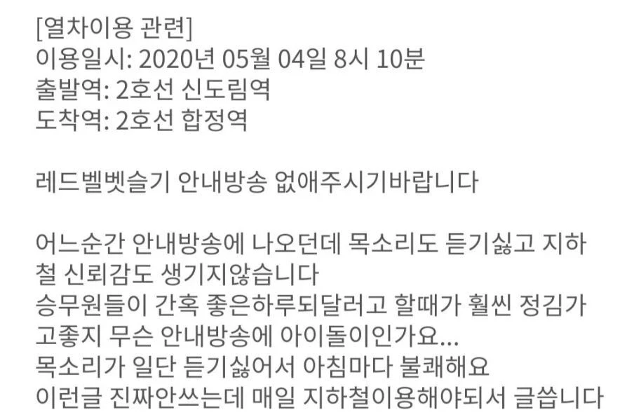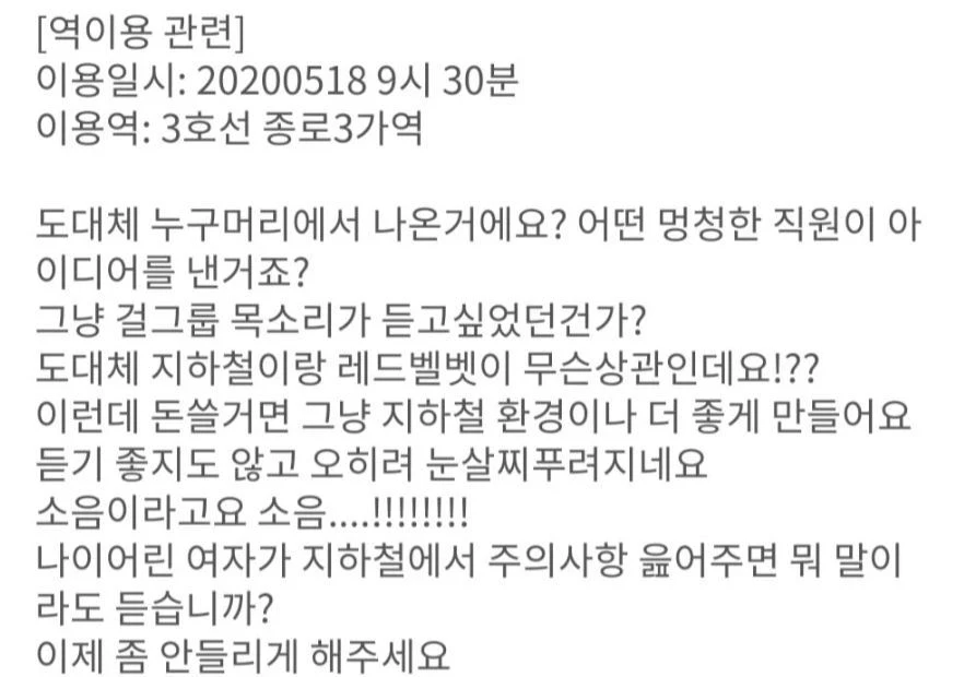 이들은 "지하철과 레드벨벳이 무슨 상관이 있나?", "나이 어린 여자가 주의사항 읊어주면 말이라도 듣나?", "(승무원에 비해) 목소리도 듣기 싫고 지하철 신뢰감이 생기지 않는다"고 말했다.