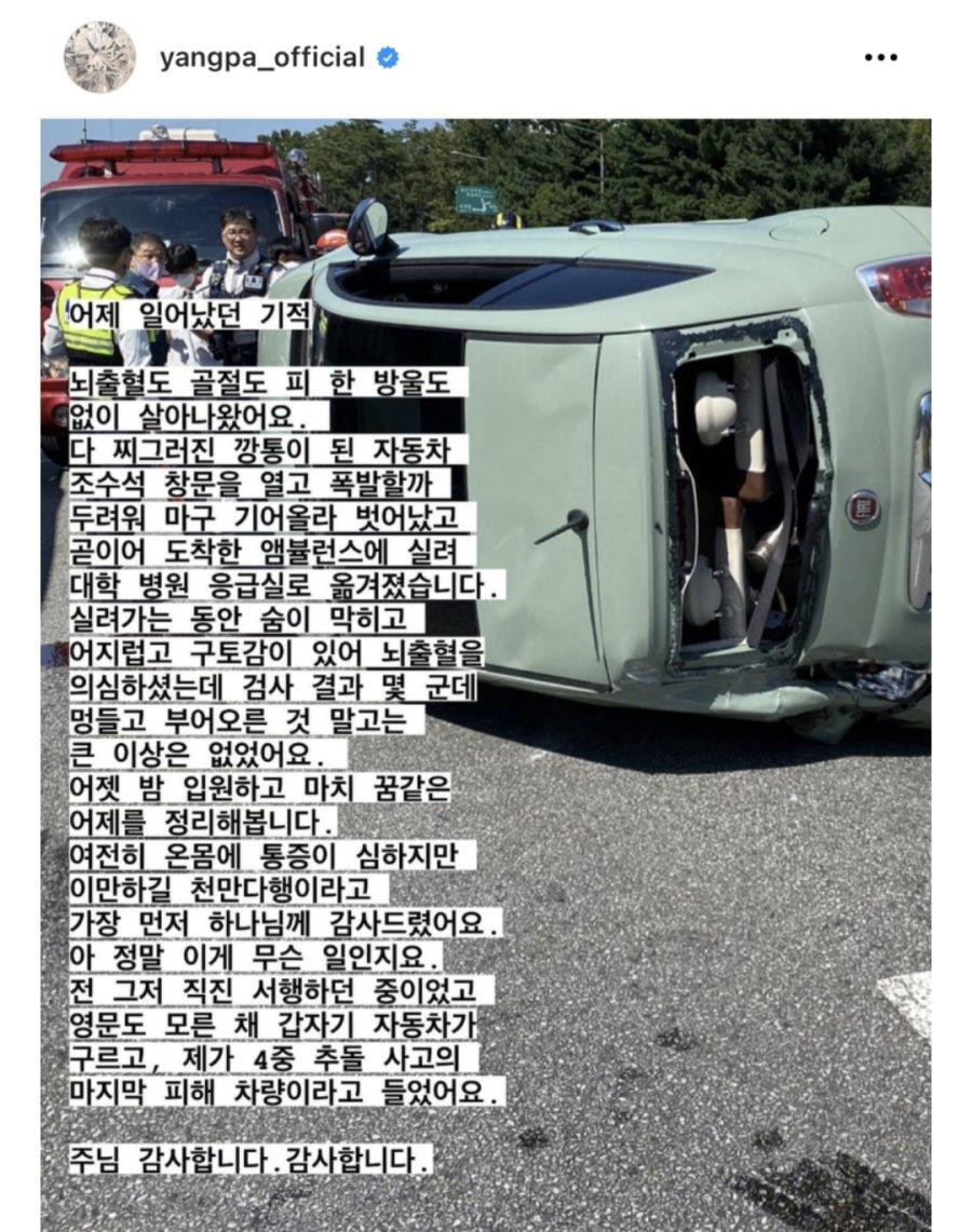4중추돌 차량 전복사고 났다는 가수 양파 근황 ㄷㄷ