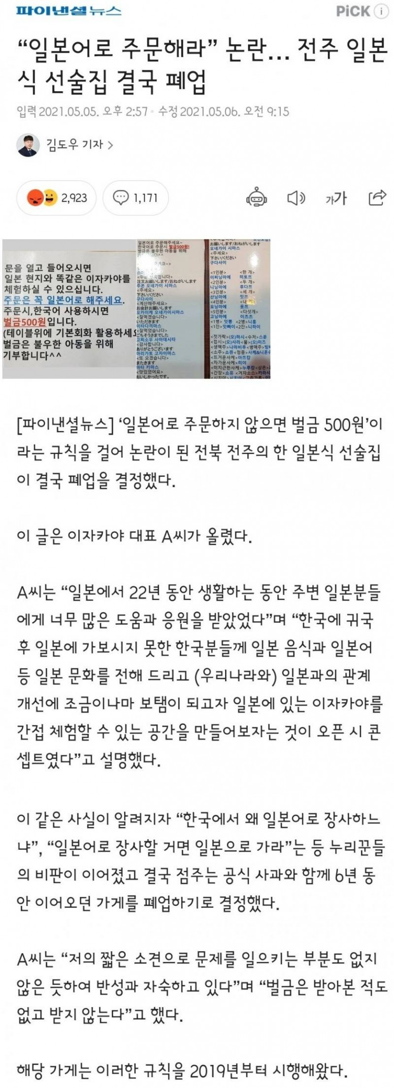 일본식 선술집 결국 폐업