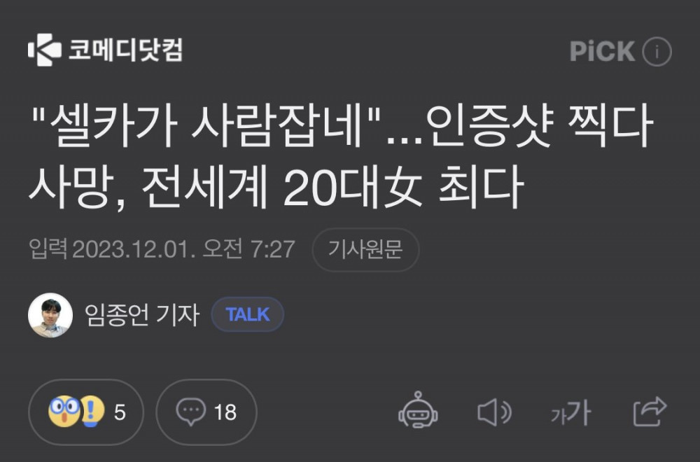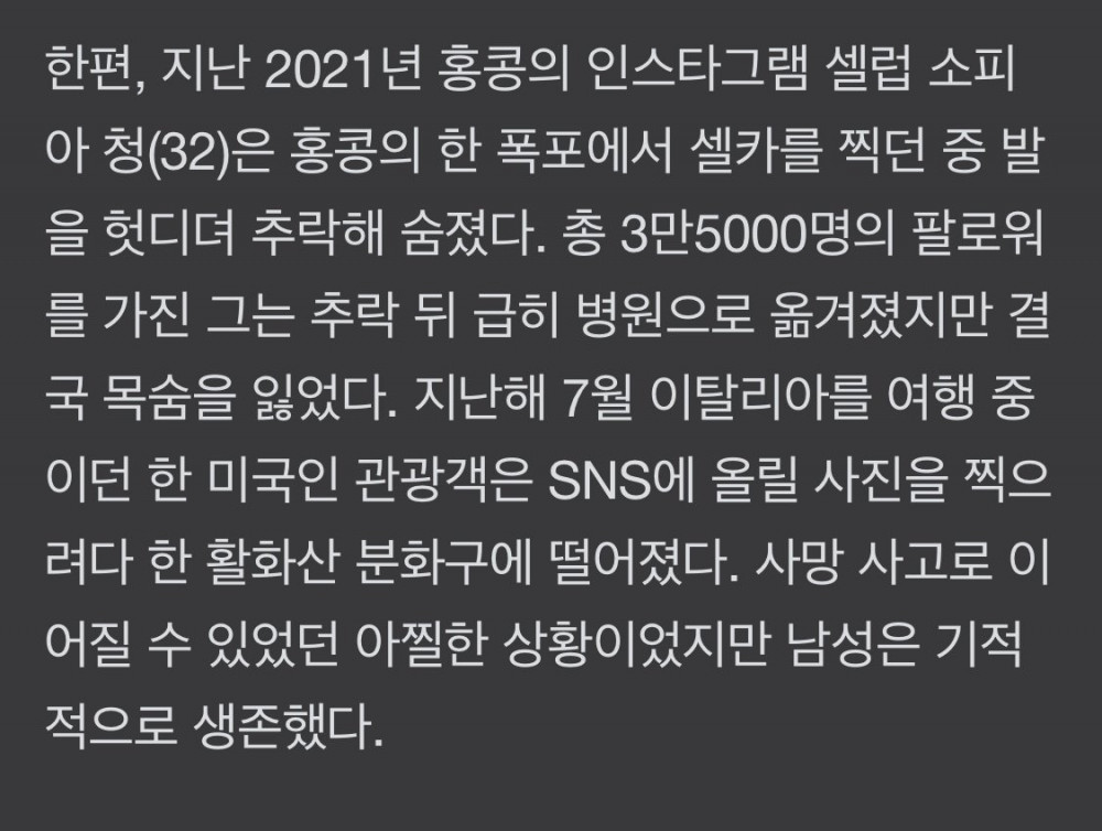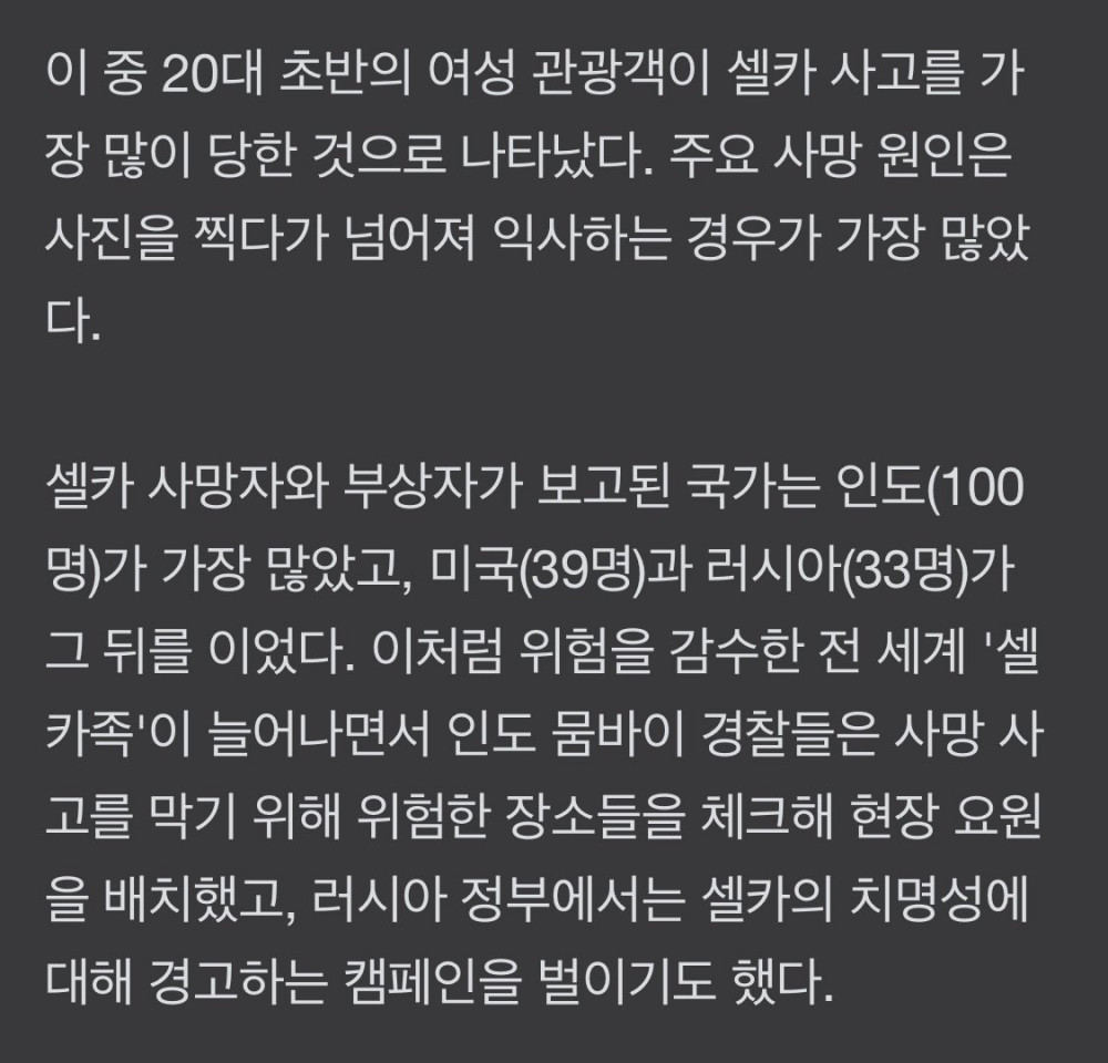 인증샷 찍다 사망, 전세계 20대 여성 최다