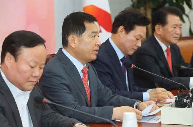 심재철 자유한국당 원내대표(왼쪽에서 두 번째)가 7일 국회에서 열린 당 원내대책회의에서 발언하고 있다 / 연합뉴스