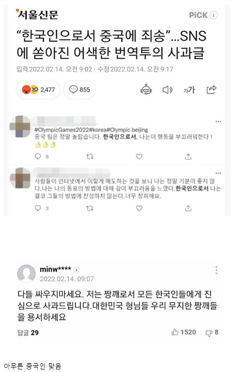 한국인에게 진심으로 사과한 중국인