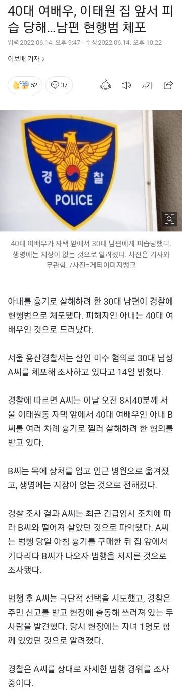40대 여배우, 집에서 흉기에 찔려..남편 살인미수 체포