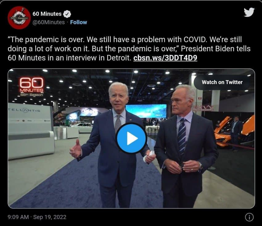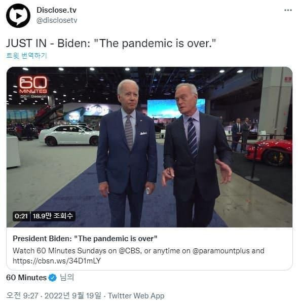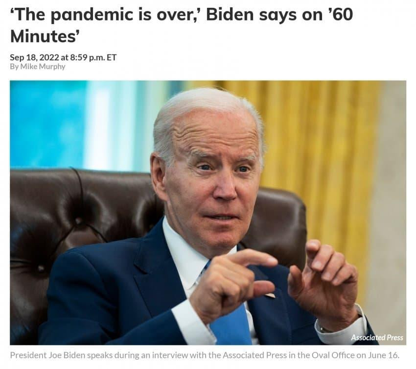 아직 코로나에 문제가 있다. 우리는 여전히 많은 일을 하고 있다. … 바이든은 CBS 뉴스 특파원 스콧 펠리에게 "그러나 전염병은 끝났다"고 말했다. "당신이 알아차린다면, 아무도 마스크를 쓰고 있지 않습니다. 다들 컨디션이 좋은 것 같아요. 그래서 저는 그것이 변하고 있다고 생각합니다. 그리고 저는 이것이 그것의 완벽한 예라고 생각합니다."