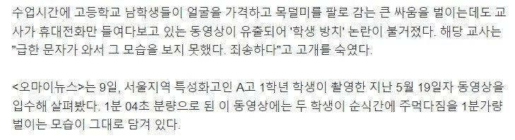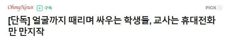 싸움 끝날 때까지 안 말린 교사...과거 '학생 방치' 전력 있다고 함...이렇게 싸움이 벌어졌는데도 같은 교실 앞쪽 왼편에 있던 B교사는 휴대전화를 계속 들여다보며 싸움을 하는 학생들에게 눈길을 주지 않았다고 함....1분여의 시간이 걸렸는데도 교사는 싸움이 끝날 때까지 말리지 않았음자질 없는 교원, 공무원 등...퇴출이 답인듯...