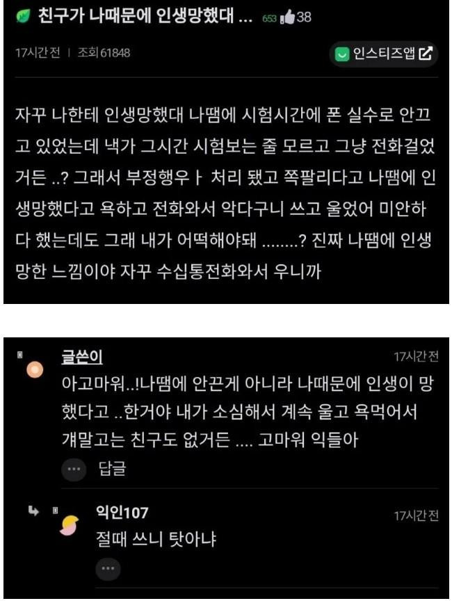 친구가 나 때문에 인생 조졌다고 함