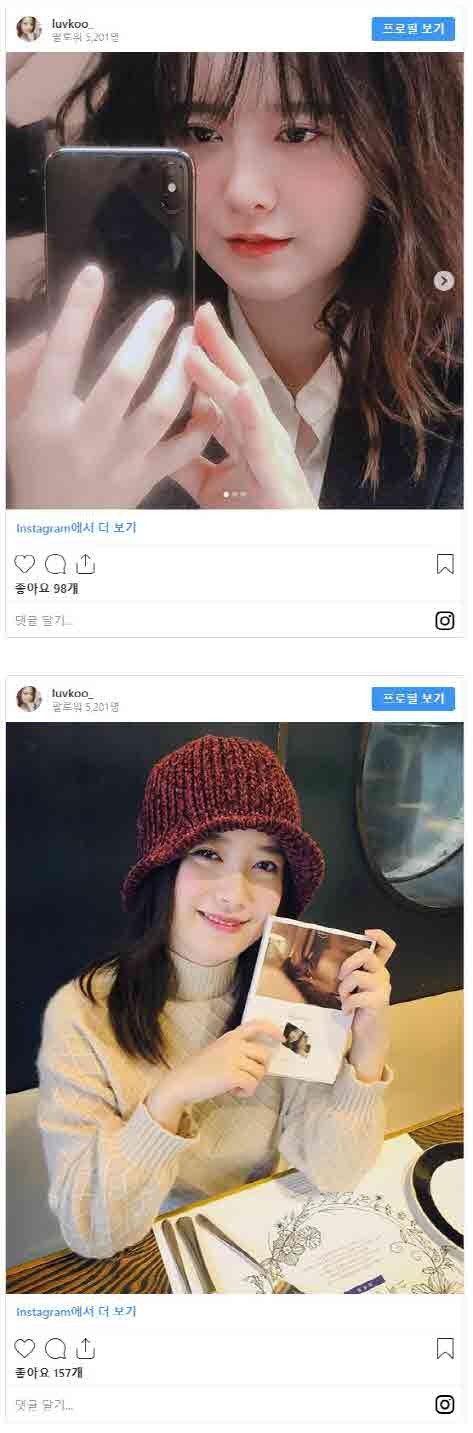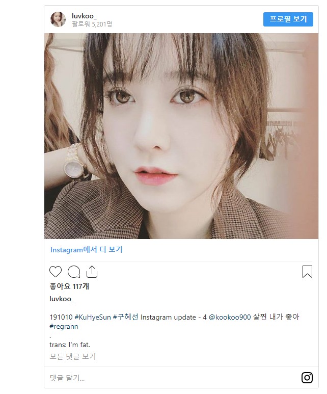 구혜선은 10일 인스타그램에 "살찐 내가 좋아"라는 글과 함께 과거보다 볼살이 오른 얼굴을 담은 사진을 게재했다.