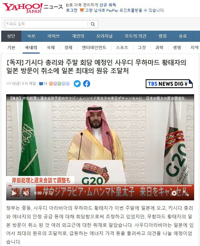 빈 살만 사우디 왕세자 일본 방문 취소됐다네요