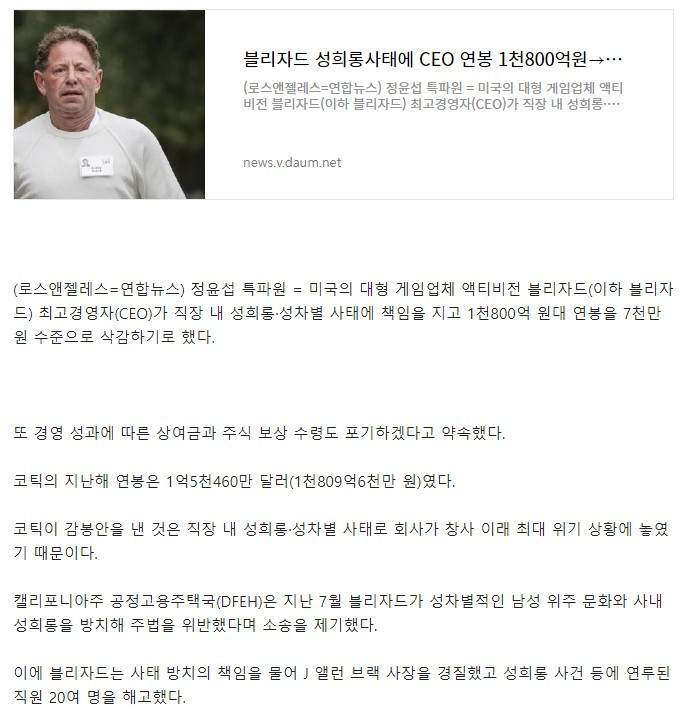블리자드 CEO 연봉 1천800억원7천만원으로 삭감