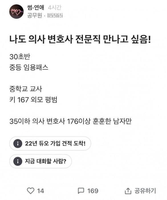 키 큰 훈남 의사 & 변호사 만나고 싶은 중학교 교사