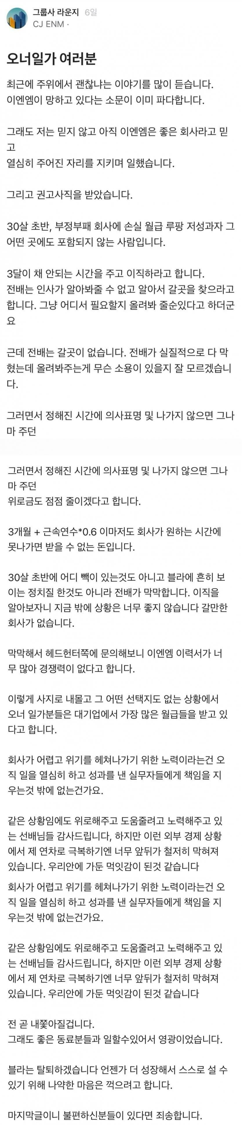 CJ 그룹사 블라인드에 올라온 ENM 구조조정 권고사직 글