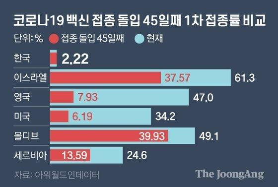 아워월드인데이터에 따르면 지난해 12월 20일 백신 접종을 시작한 이스라엘은 45일째인 지난 2월 2일 접종률이 37.57%(1차 접종 기준)에 달했다. 한국보다 35.35%포인트나 높았다. 지난해 12월 8일 세계에서 첫 접종에 들어간 영국은 올해 1월 21일 7.93%를 기록했다. 같은 달 14일 시작한 미국의 지난 1월 27일 접종률은 6.19%였다. 몰디브, 세르비아의 45일째 접종률은 각각 39.93%, 13.59%였다.