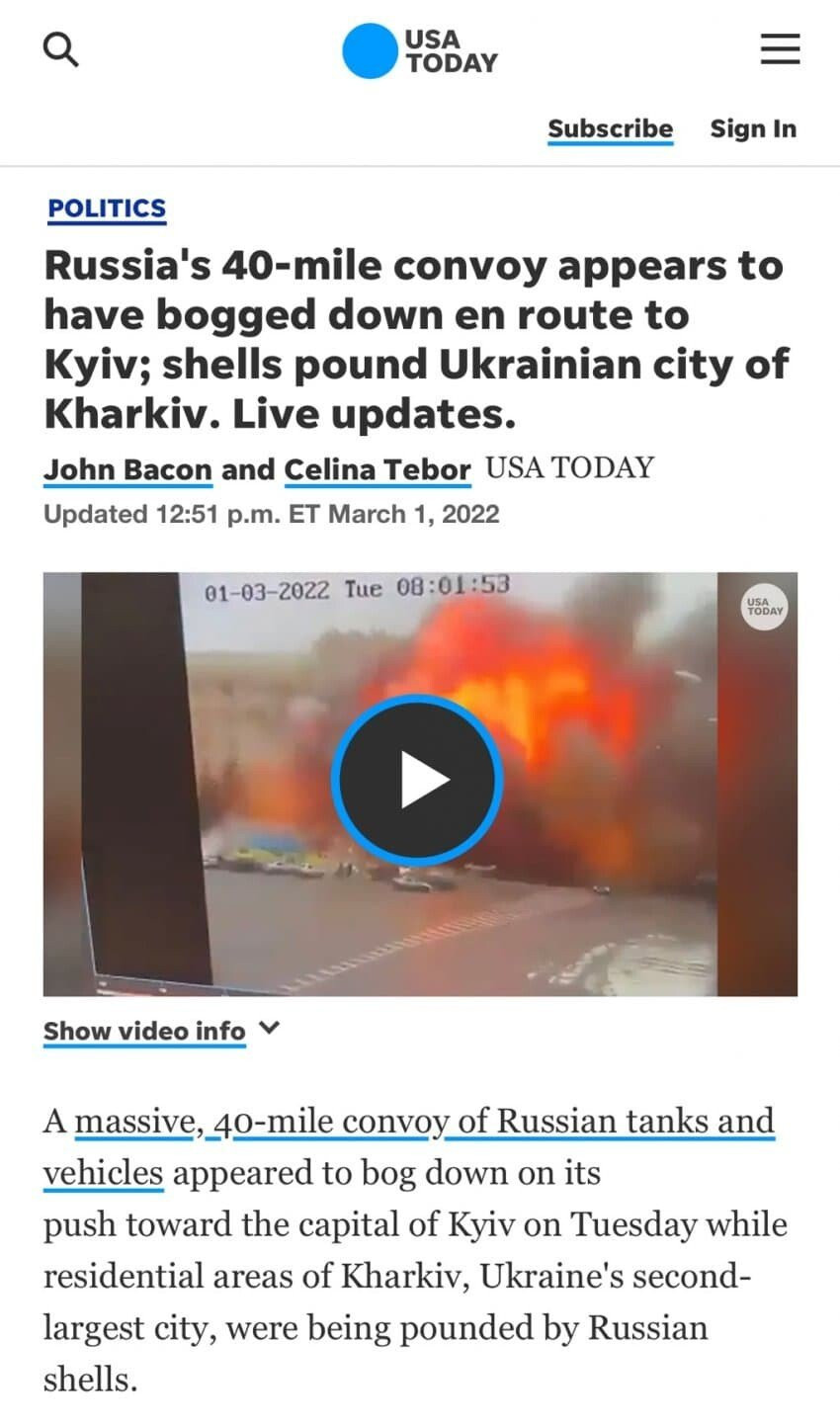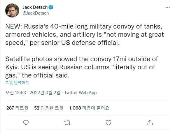 키예부(키예프)공략을 위해 대략 7~8만명의 기갑부대를 키예프쪽으로 진군시켰는데 연료가 없어서 키예프 앞 64km에서 돈좌되버림ㅋㅋㅋ 기갑부대 행렬 길이가 대략 4~5km정도 세계 2위의 군사강국이 기름이 없어서 작전 진행이 안되고 그대로 갇힌 상황이라는게 웃음벨이고 이게 무려 미 국방부 오피셜이라는게 ㅋㅋㅋ