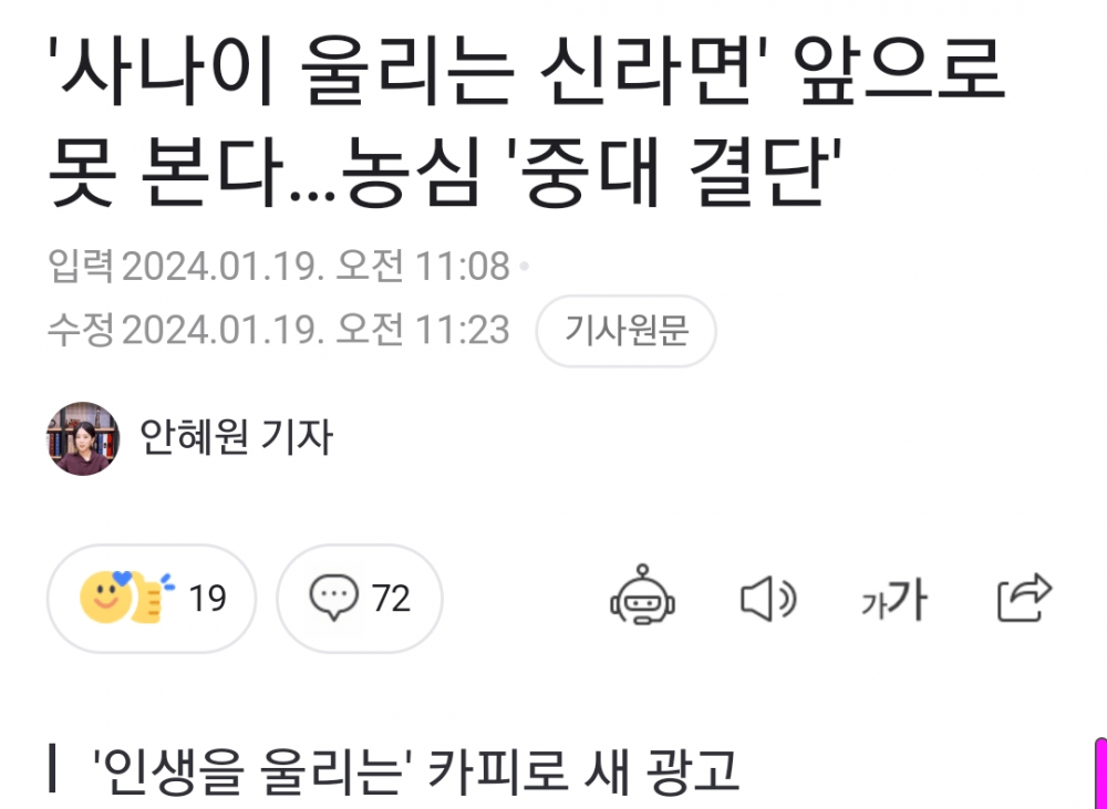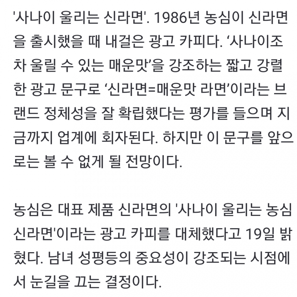 농심의 새 TV 광고에는 '인생을 울리는 신라면'이라는 새로운 카피가 들어간다. 일반인 모델을 활용해 일상의 순간을 함께하는 대한민국 대표 라면의 친근함과 일상성을 강조하는 콘셉트다. 출시 이후 줄곧 사용된 '사나이 울리는 신라면'이라는 카피는 눈물이 나올 정도로 맛있게 매운맛을 강조했다면, 새롭게 선보이는 '인생을 울리는 신라면'은 단순한 식품을 넘어 고객과 희로애락을 함께 하며 정서적 교류를 나누는 동반자가 되겠다는 의미가 있다고 농심은 설명했다.