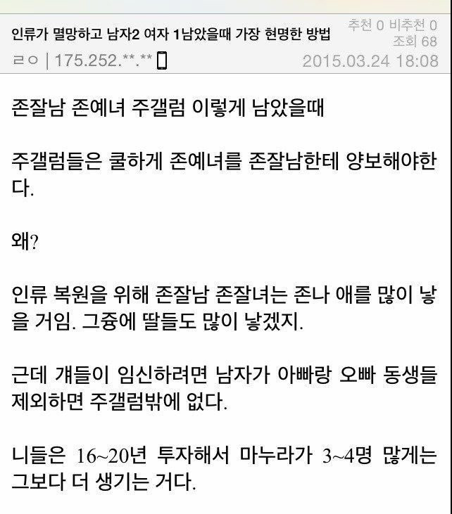 인류가 멸망해 존잘남 존예녀 주갤럼 셋이 남았을 때