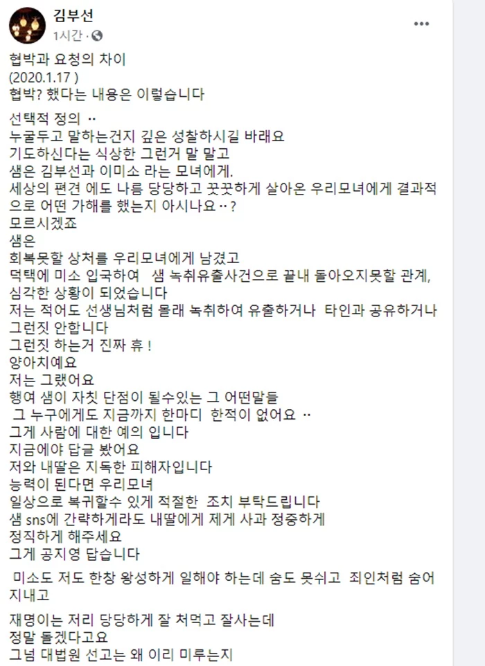 이어 "그녀가 내 전 남편이 자신에게 보낸 음란사진을 공개한다고 내게 협박을 해 왔던 것이 거의 일 년 전이었다. 전 남편 사이에서 낳은 우리 아이가 타격을 입을 테니 그걸 막으려면 자기에게 공개 사과하라고 했다. 녹음 유출에 대해 경찰 조사 후 무혐의 되었지만 자기와 딸에게 공개 사과하라고 했다"라고 전했다.