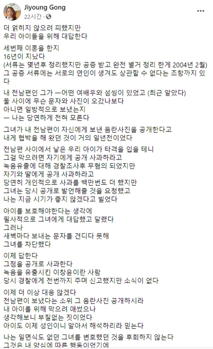 공 작가는 단단히 결심이 선 듯한 말투로 "이제 더 이상 대응 않겠다. 전 남편이 보냈다는 소위 그 음란 사진 공개하시라. 내 아이를 위해 막으려 애썼으나 생각해보니 부질 없는 짓이었다. 아이도 이제 성인이니 알아서 해석하리라 믿는다"라고 전했다.