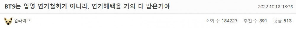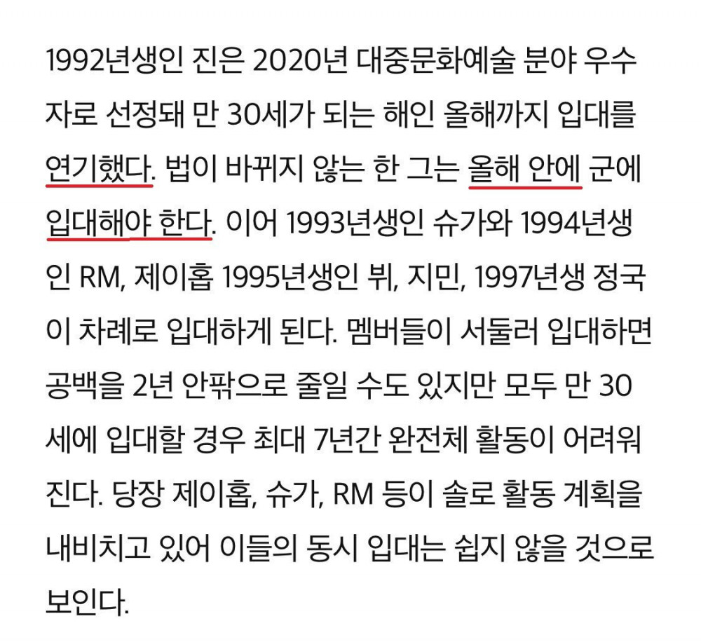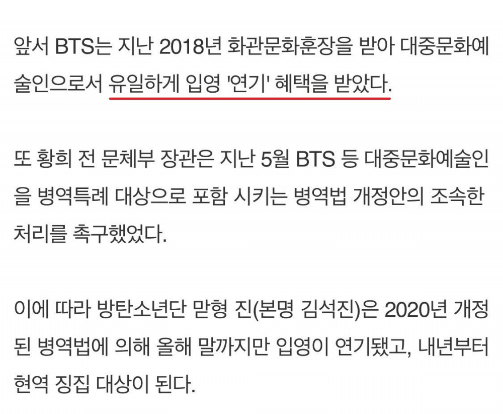 '입영연기'라는 특별한 혜택을 BTS는 이미 2년째 받고 있는중이야.