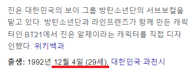 진의 나이상 만 30세가 한달 좀 넘게 남아서