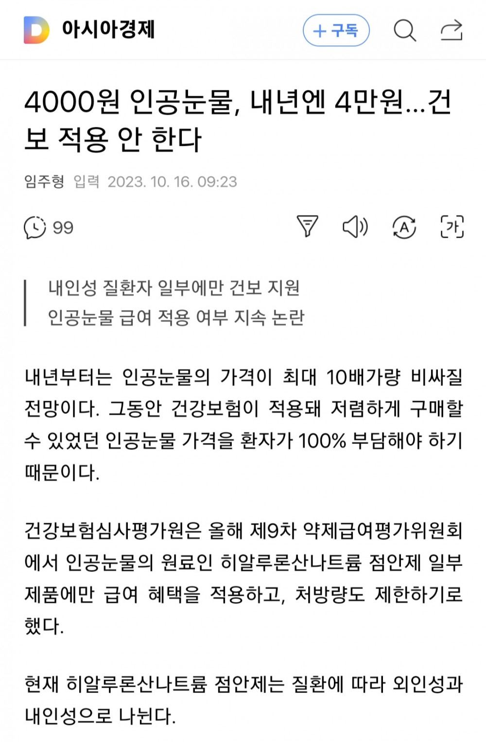인공눈물 내년부터 4천원->4만원으로 ㄷㄷ