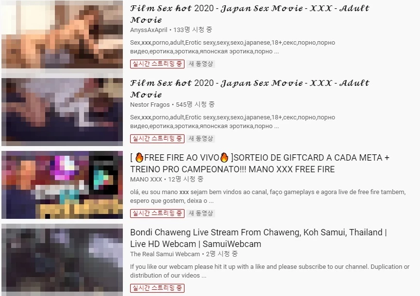 28일 오전 9시 30분 기준 각종 유튜브 채널에서 실시간 스트리밍으로 일본산 야동을 송출하고 있다. 약 2만 4000여 명이 시청 중이다.