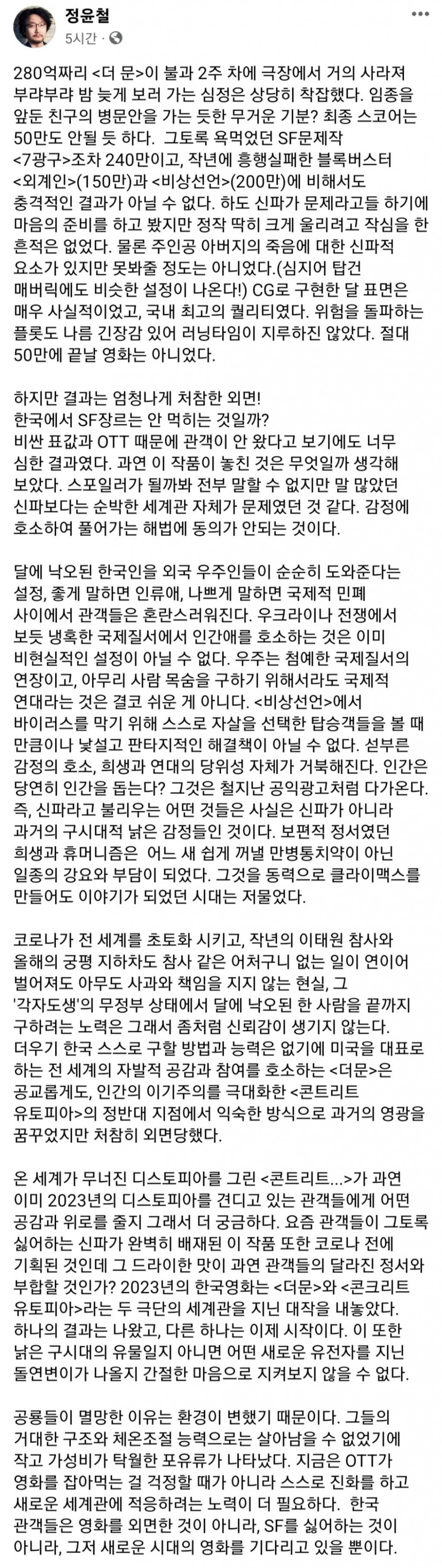 3줄 요약1. 인간은 인간을 돕는다는 이야기는 이제 철지난 공익광고 같은 판타지적 이야기2. 코로나, 여러 참사를 통해 사람과의 신뢰감이 깨진게 현실이다3. 감독들은 OTT나 여러 탓을 할게 아닌 자기 자신이 진화하고 적응해야 한다