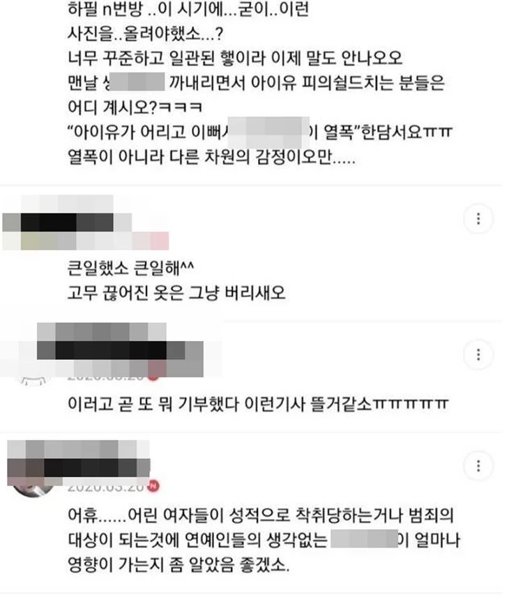 댓글에는 “하필 n번방 이 시기에 굳이 이런 사진을 올려야겠냐”, “이런 컨셉이 얼마나 여자들의 범죄에 영향이 가는지 알았으면 좋겠다”, “이러다가 또 기부하겠지”라며 도를 넘는 악플들이 달렸다.