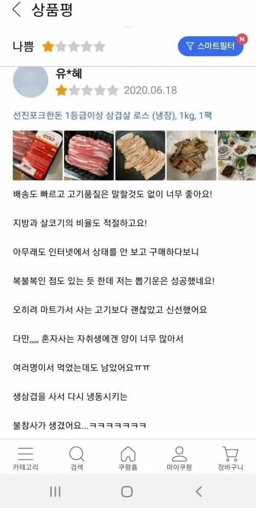 자취생의 삼겹살 상품평.. 별점 1개의 이유...