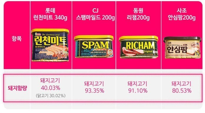 스팸 vs 런천미트 vs 리챔 vs 안심팜 고기 함량 차이