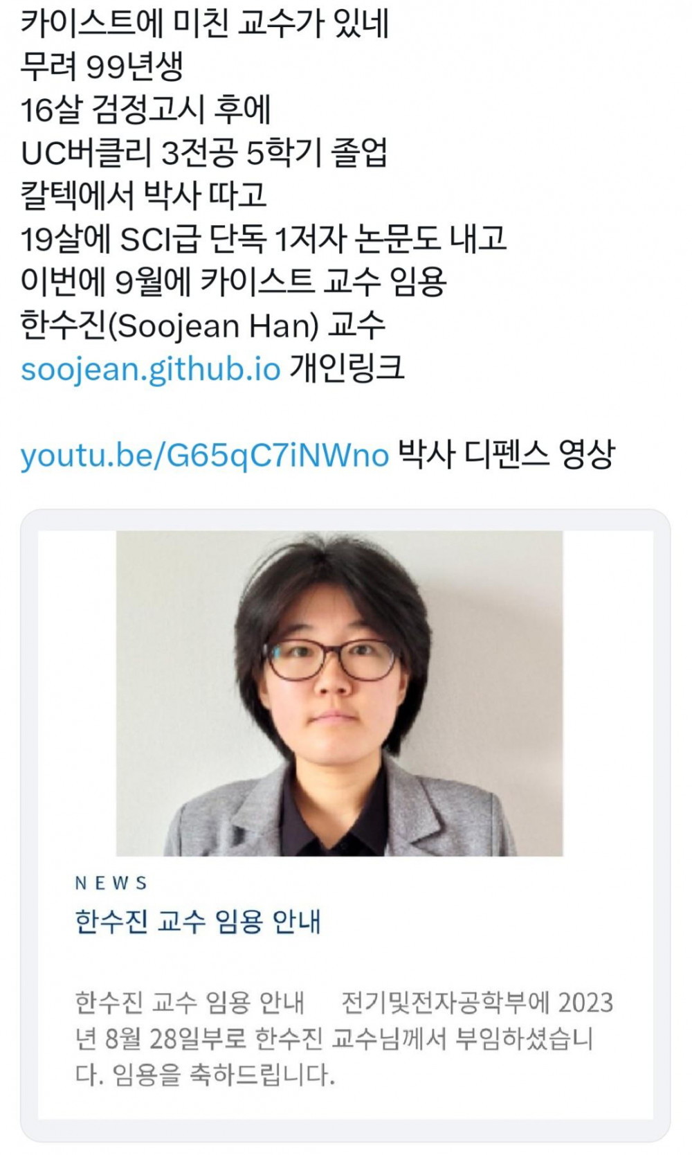 최근 카이스트에 임용된 99년생