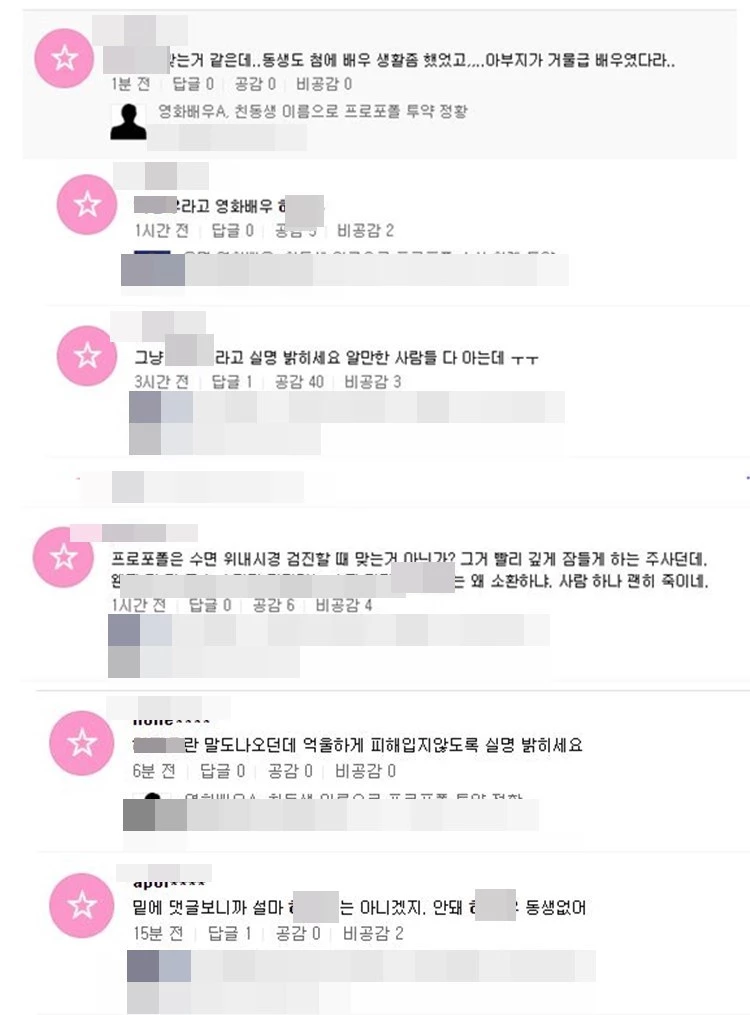 배우 A씨가 의심을 받자 팬들은 "억울하게 피해 입지 않도록 실명 밝혀달라", "갑자기 A씨는 왜 소환하냐, 사람 하나 괜히 죽이는 것"이라고 댓글을 단 네티즌들을 비난했다.