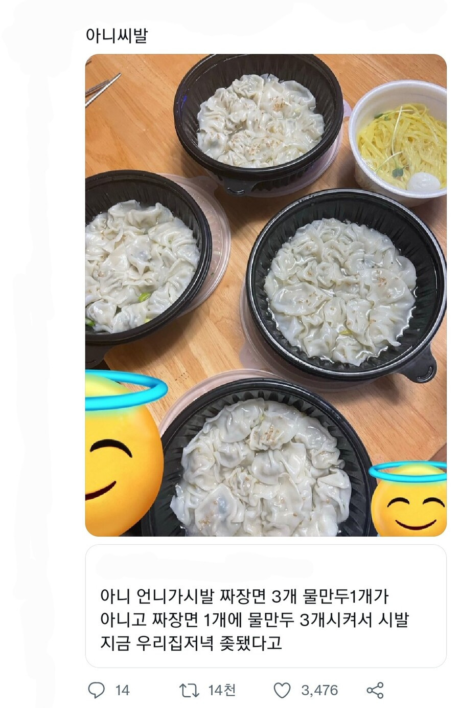 짜장면 3개 물만두 한개 시켜