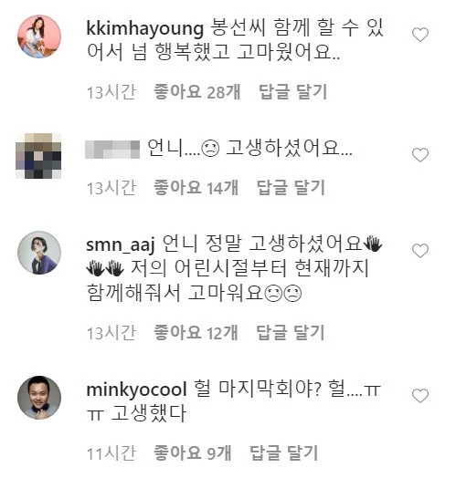 개그맨 선·후배인 김숙, 송은이, 박미선, 김태균, 김지민, 안영미 씨와 배우 김민교, 김하영 씨는 "앗.....마음 한구석이........으......., "봉슨아...애썼어....", "봉선아.... 다들.....", "안타깝구나", "언니 정말 고생하셨어요...저의 어린 시절부터 현재까지 함께해줘서 고마워", "선배님 정말 고맙습니다...", "헐 마지막회야? 헐....ㅠㅠ 고생했다", "봉선씨 함께 할 수 있어서 넘 행복했고 고마웠어요" 등의 댓글을 남겼다.
